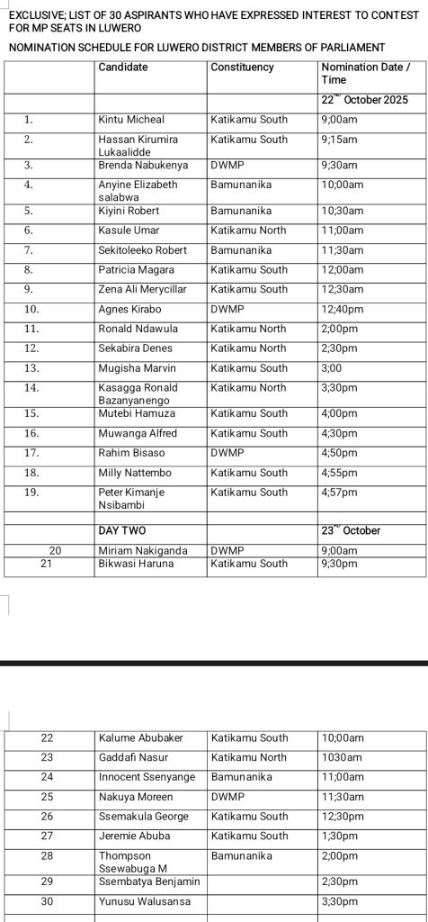 The process, scheduled for Wednesday 22nd and Thursday 23rd October 2025, will see both seasoned politicians and new entrants battle for four key parliamentary positions — Katikamu North, Katikamu South, Bamunanika, and the District Woman Member of Parliament (DWMP) seat.