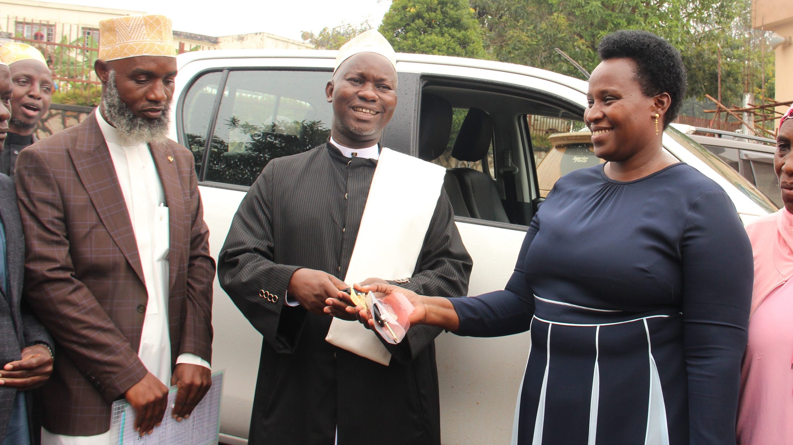 Two new double-cabin pickup trucks drove into Masaka under State House authority. The vehicles went to Masaka District Kadhi Huzairu Kiruuta and Old Kampala District Kadhi Yasin Nseera. A separate coaster went to the Kitovu Youth Parish and the Kimaanya Catholic Choir.